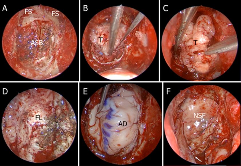 图4. 为图3患者,在30°内镜下经鼻入路切除OGM。A.在前颅底(ASB)腹侧作锁孔小骨窗切除颅底骨质,矢状面上从额窦(FS)后到蝶骨平台、冠状面上从左侧筛骨眶板到右侧筛骨眶板形成骨窗,电凝ASB硬脑膜使肿瘤血管闭塞;B、C.打开硬脑膜,先作肿瘤内部分块切除,再沿边界将肿瘤(T)小心地从额叶上分离;D.肿瘤切除后,额叶(FL)留下的空腔;E.用人工硬膜放置在颅底硬膜缺损处;F.将带血管蒂的鼻中隔粘膜瓣(NSF)旋转并覆盖颅底缺损处;粘膜瓣上做一个松弛的蝶形切口(箭头)以增加前后伸展度,向前到额窦的后表面和向后到蝶骨平台完整覆盖,保持血管蒂血流通畅;重建颅底。