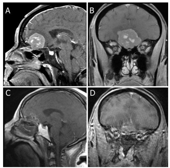 图3. A-B.术前MRI显示OGM;C-D.内镜下经鼻入路切除OGM术后的MRI成像。