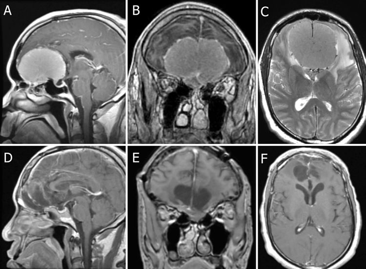 图5. A-C.术前MRI显示OGM;D-F.内镜下经鼻入路和联合经额底入路切除OGM后的MRI成像。