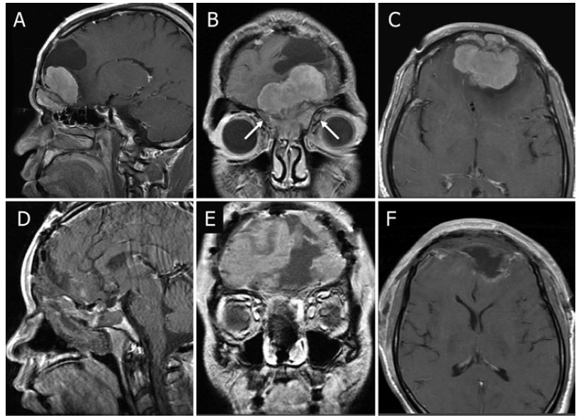 图1. A-C.术前MRI显示OGM;D-F.经额底入路切除OGM术后的MRI成像。