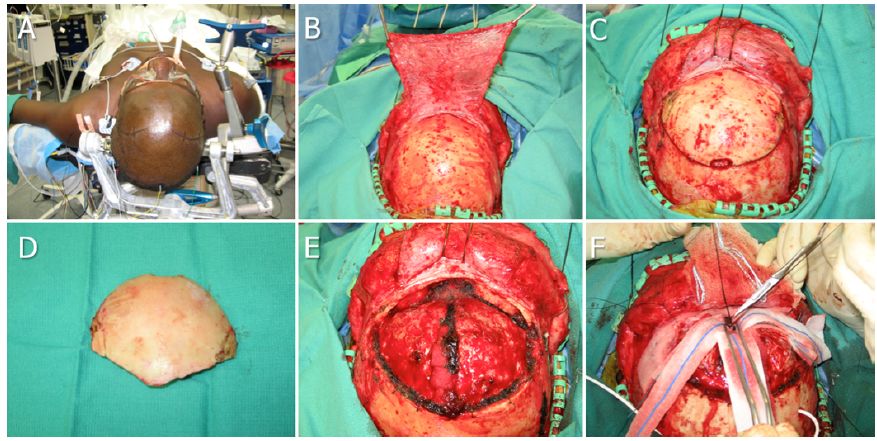 图2. 为图1患者,经扩大额底入路。A.仰卧位,双额冠状切口;B.保留带血管蒂的骨膜瓣,翻向前,供颅底重建时使用;C、D.作双侧额骨瓣包括额窦的前骨板,骨窗前缘达鼻上缝和眶顶水平;E.骨窗前缘暴露低,可防止阻挡观察筛板的视线,不必切除眉弓;F.双侧额部硬脑膜平行骨窗两侧缘和后缘冠状切开,矢状窦用缝线结扎,然后与大脑镰分离,翻向鼻、眼眶侧。