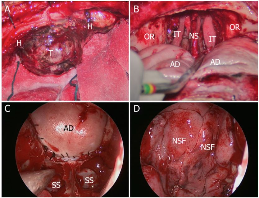 图6. 为图5患者,联合入路切除OGM。A.经额底入路,肿瘤(T)位于颅底前部沿眶上壁向两侧生长。额骨内表面有明显的骨质增生(H)。经额底入路切除肿瘤的颅内和颅外部分,磨除增生的骨质;B.经额底切除肿瘤后,硬脑膜缺失人工脑膜贴片修补;通过两侧眶顶(OR)可见鼻中隔(NS)和下鼻甲(IT);C.内镜下经鼻检查,鼻腔内无残留肿瘤,颅底缺损处可见人工脑膜贴片;D.内镜下用双侧鼻中隔粘膜瓣(NSF)修复颅底缺损。