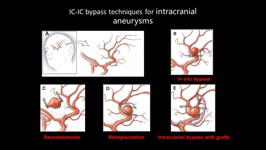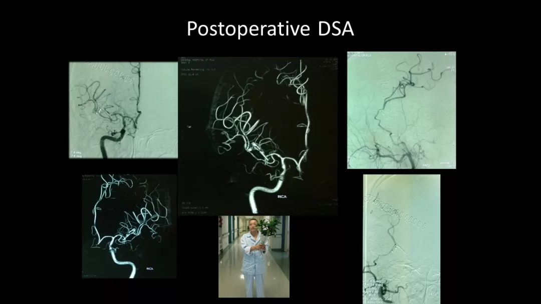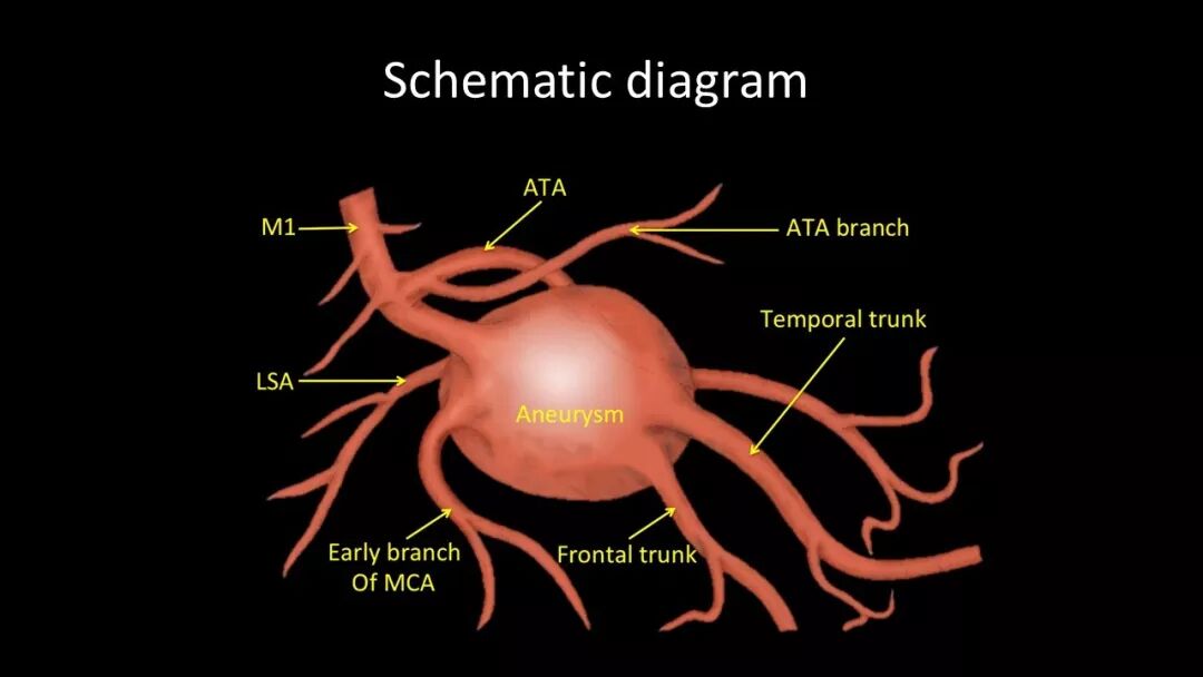 (1)病例本身特殊。众所周知,大脑中动脉一般两个分支,所以大脑中动脉分叉部动脉瘤,即使巨大动脉瘤,也一般只需要重建两支累及的血管,但该动脉瘤累及了四支血管,并有一支极细小的豆纹动脉。所以才成全了该病例“四支血管架桥”的特殊性。