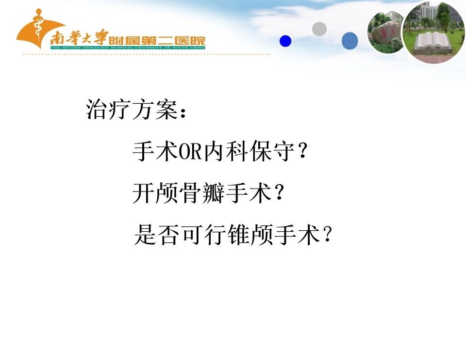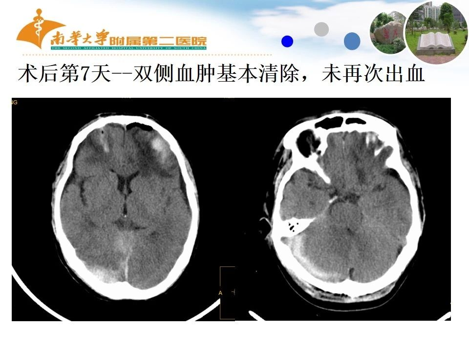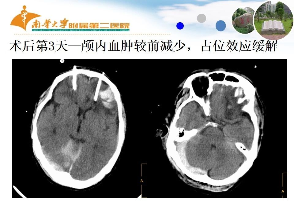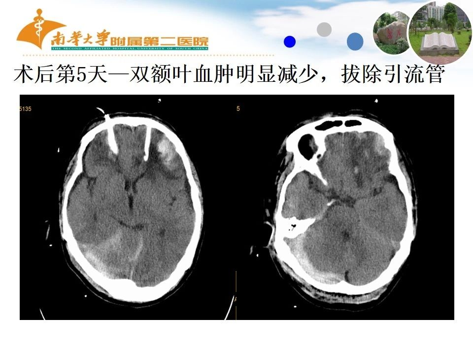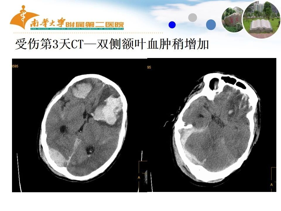 3. 手术方式问题:该患者为颅内多发血肿,未提供全部层面的CT照片,但从受伤3天复查的CT发现双额叶血肿增加,占位效应主要为双额叶别是左额叶损伤为主,应该考虑首先清除双额叶血肿。枕部跨横窦的血肿没有增加且量不多,可以保守观察,或者是先做CTV或MRV,没有发现横窦受压闭塞无须手术。因此该例患者应该行冠状切口开颅双额叶血肿清除,或者是术中清除左额叶损伤后,监测颅内压不高,右额叶损伤也可以先保守。一旦术中发现明显颅内高压脑膨出还需去骨瓣减压。虽然该例经双额锥颅引流血肿最终治愈,但应该采取规范化的开颅手术,现有的治疗指南不提倡这种手术方式。锥颅血肿引流只能作为在不具备开颅手术条件且发生脑疝非常紧急情况下的一种临时急救措施。