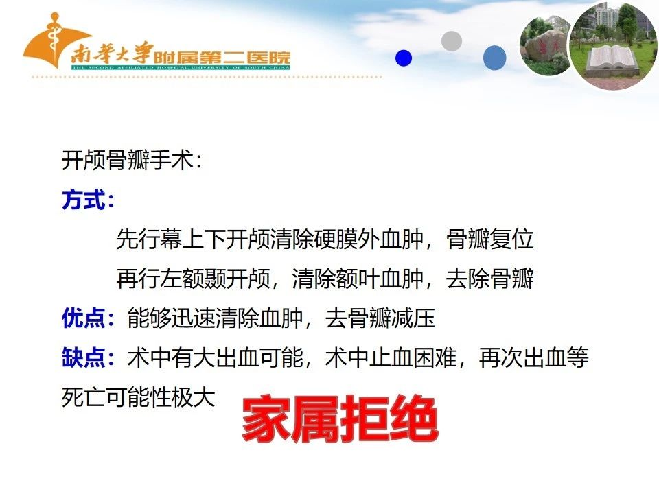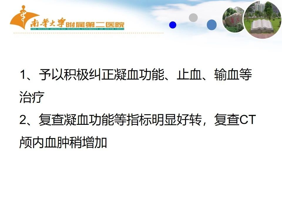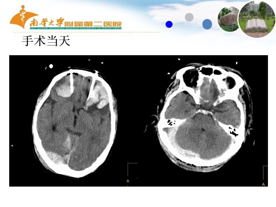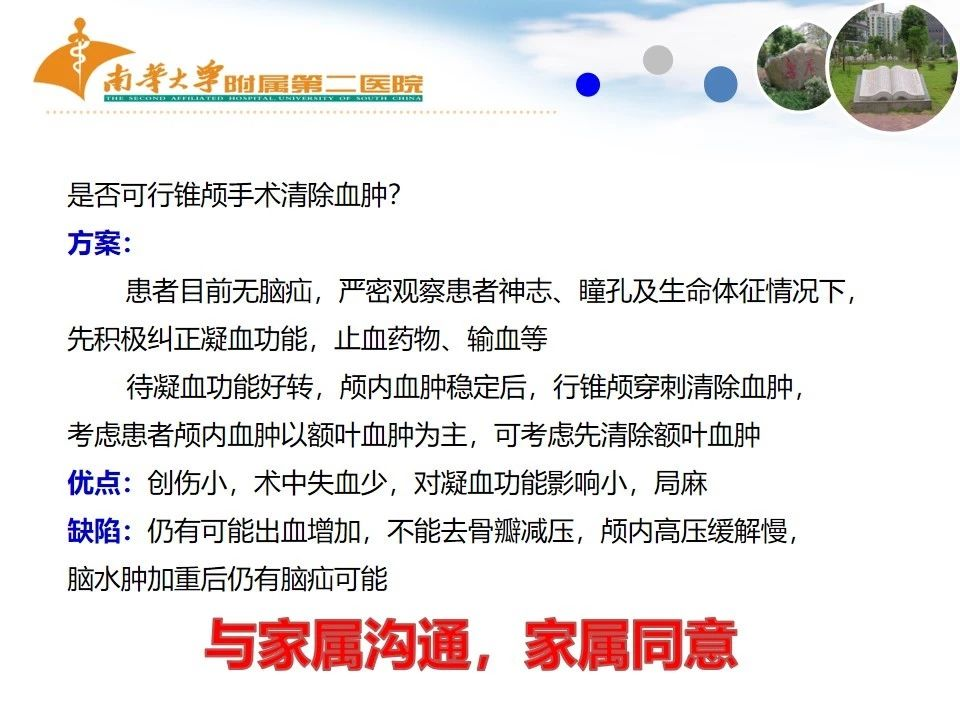 2. 手术指征及手术时机问题:患者昏迷、血肿量大于30ml。入院手术指征明确,但患者存在凝血功能障碍,尚未发生脑疝,可以先给予保守治疗,等待纠正凝血功能障碍后再手术。一旦病情加重发生脑疝,虽然未及纠正凝血功能障碍,也必须及时手术,一边输注血小板、新鲜冰冻血浆等纠正凝血功能障碍一边手术。如果术中发现确实止血困难无法清除脑内血肿,可以采取损伤控制外科技术,先行去大骨瓣减压缓解颅内高压,等待纠正凝血功能障碍后再进行确定性手术即清除脑内血肿。幸好患者未发生脑疝,可以等到凝血功能基本正常才手术,但期间用时3天,风险比较大,要引起重视。