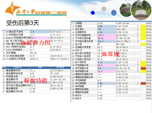 1. 凝血功能障碍诊治问题:目前缺乏统一标准,一般根据常规凝血功能指标,认为在严重创伤后存在以下状态即可诊断凝血功能障碍(创伤性凝血病): PT>18s、APTT>60s、TT>15s( 较正常上限延长50% 以上)、INR≥1.5 或PT比值>1.2、PLT<100×109 /L、FIB<1.0g/L。该例通过血常规、凝血功能及血栓弹力图检查,凝血功能障碍诊断成立,主要因素为血小板低、纤维蛋白原低、凝血因子活性不足,可以通过输注血小板、新鲜冰冻血浆、纤维蛋白原等纠正。但作者未详细说明如何纠正凝血功能障碍。