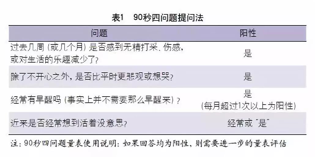 “90秒四问提问法”及PHQ-9等简便易行的问卷可以用来筛选可能的抑郁患者。