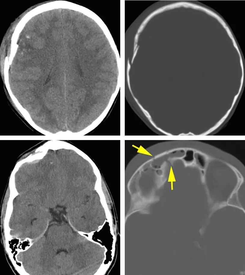 图1.CT平扫显示右侧额骨凹陷性骨折伴点状脑挫伤(上图)。骨折碎片凹陷超过颅骨厚度,硬膜损伤可能性高。下图展示的是一右侧额骨凹陷性骨折累及额窦前壁及后壁(箭头)。