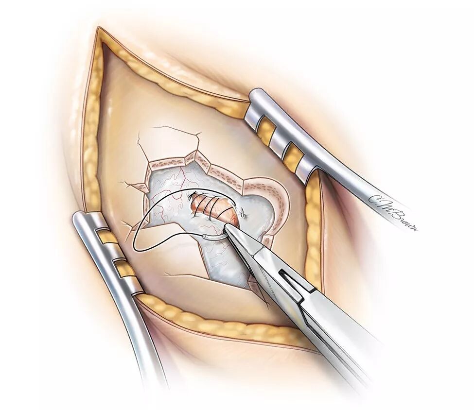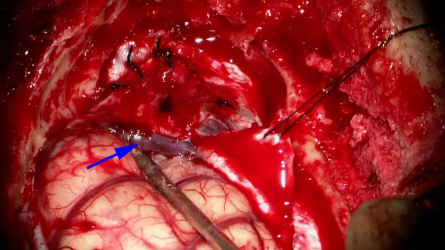 如果必须手术干预,应采用发际线后冠状切口。开颅过程中留取一片以眶上缘为基底的带血管蒂骨膜瓣。