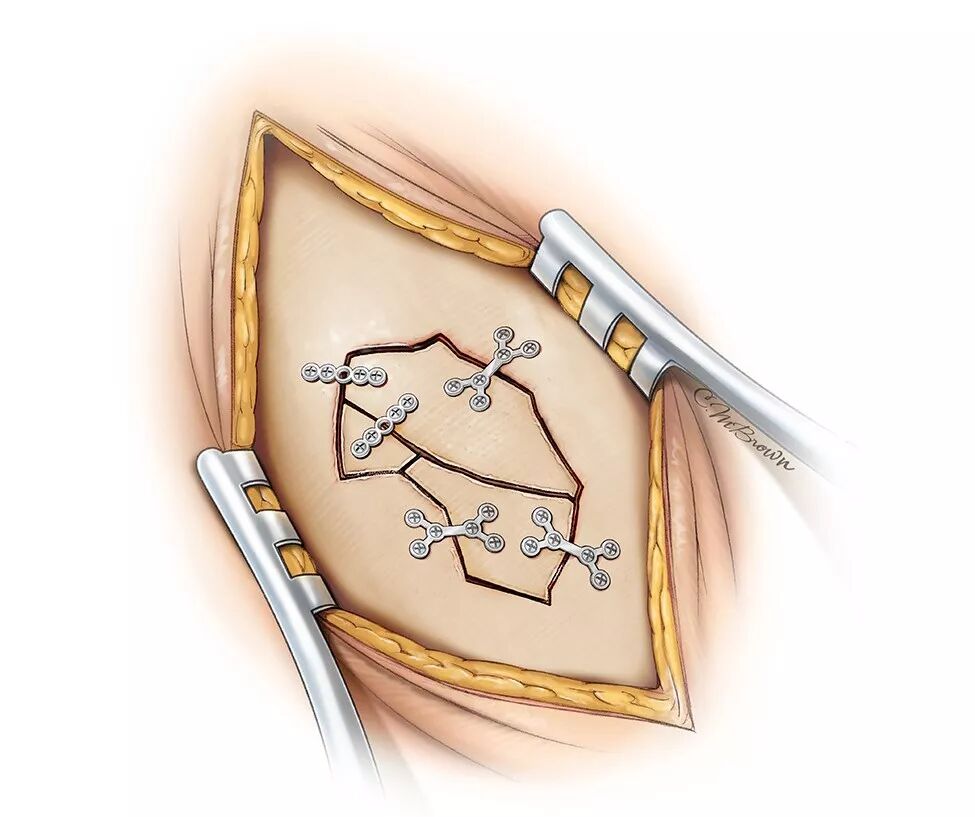 图5:在对脑组织、硬脑膜及颅骨清创并彻底冲洗后,连接片连接碎骨片后还纳。