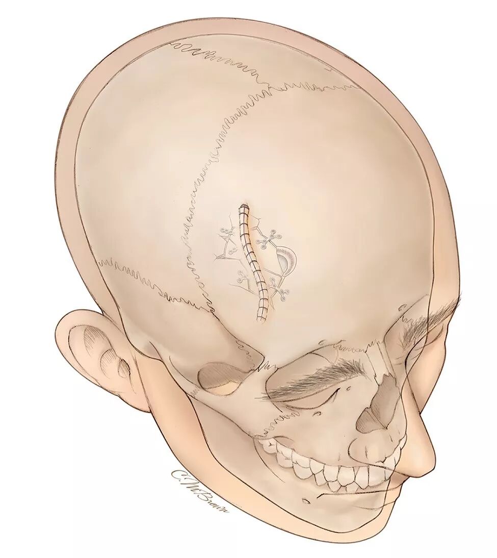 图2.发际线后额骨骨折展示。骨折呈碎片状并且凹陷。虚线为拉长的“S”切口,将皮肤裂口包含在内,并且能够获得足够的术区暴露。