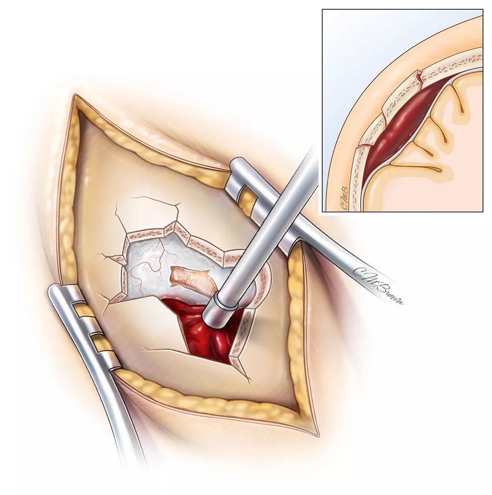 受压的脑组织应检查是否有挫伤或坏死。轻柔的吸除坏死脑组织直至看到相对正常的脑组织。笔者并不强求一定要清除嵌入脑深部的小碎骨片,这是要以进一步损伤脑皮质为代价的。积极地清除坏死脑组织在可能会导致额外损伤及出血的情况下并不推荐,特别是在功能区附近。