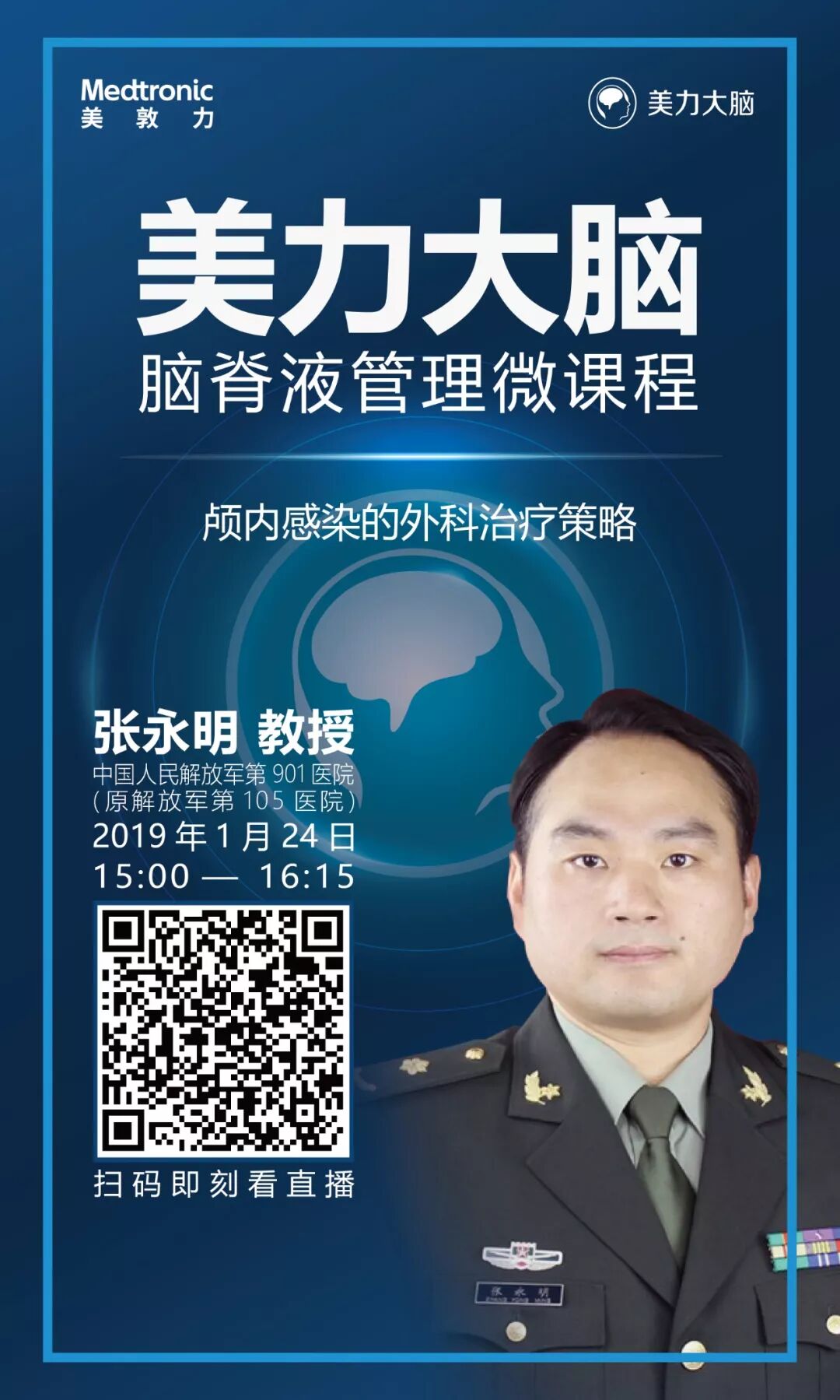 “美力大脑-脑脊液管理微课堂”第八期将于2019年1月24日由中国人民解放军第901医院(原解放军第105医院)张永明教授为大家带来分享——颅内感染的外科治疗策略。