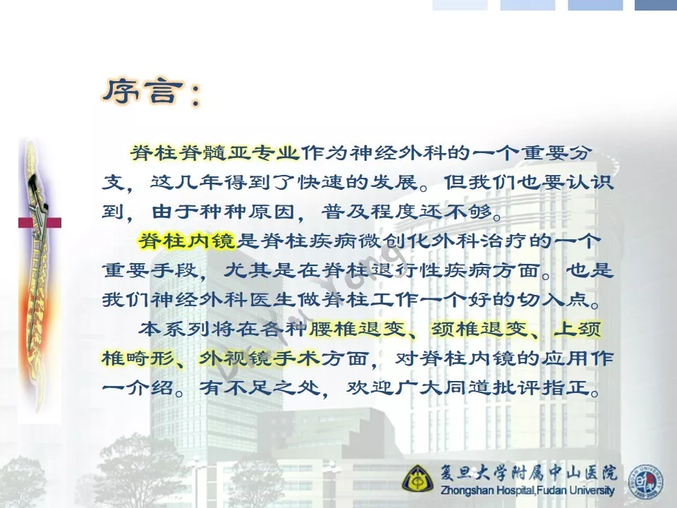 脊柱脊髓亚专业作为神经外科的一个重要分支,近年来得到快速发展。但是,由于种种原因,普及的程度还不够。脊柱内镜是脊柱疾病微创化外科治疗的一个重要手段,尤其是在脊柱退行性疾病方面。也是我们神经外科医生做脊柱工作一个好的切入点。本系列将在各种腰椎退变、颈椎退变、上颈椎畸形、外视镜手术方面,对脊柱内镜的应用作一介绍,并提供典型病例的相关手术视频资料。有不足之处,欢迎广大同道批评指正。