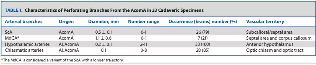 1997年Serizawa根据分布区将前交通动脉(anterior communicating artery,AcomA)各穿支分为胼胝体下动脉(subcallosal artery,ScA)、下丘脑穿支动脉(hypothalamic artery,HypoA)和视交叉穿支动脉(chiasmatic artery,ChiasmA)三组。美国匹兹堡大学医学中心神经外科的Edinson Najera等重点研究ScA的解剖变异并探讨其在经颅和内镜下经鼻(endscopic endonasal approach,EEA)手术中的应用,结果发表于2018年12月的《Oper Neurosurg (Hagerstown)》在线