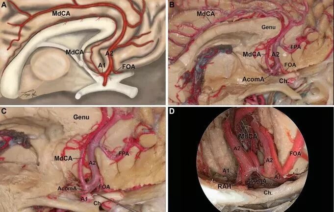 图2. MdCA解剖。A.解剖图;B、C.MdCA的发出部位与方式、走行和供血区与ScA类似,但MdCA继续后行直至胼胝体压部,支配区域更广;D.内镜经鼻观察,见MdCA位于AcomA后上方,于双侧A2之间朝向后上方走行。