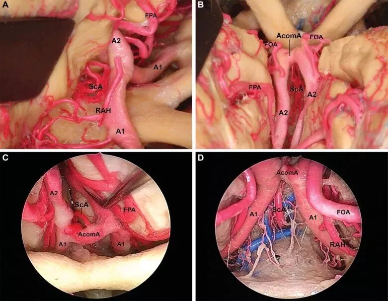 图3. ScA与毗邻结构的相互关系。A.翼点入路时,采用经侧裂-额下通道从侧方暴露胼胝体下区,此时ScA位于同侧A1和A2的内后方;B.前纵裂入路中,ScA位于AcomA上方、双侧A2之间;C、D.EEA中,ScA发自AcomA后上方。RAH Heubner:回返动脉;FOA:眶额动脉;FPA:额极动脉。