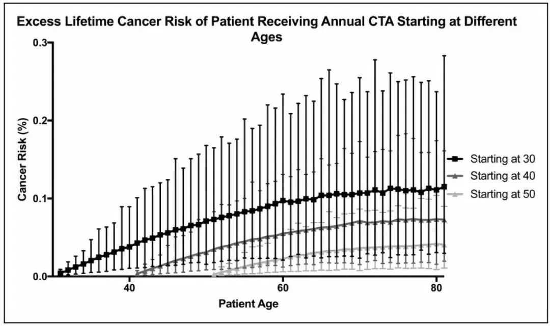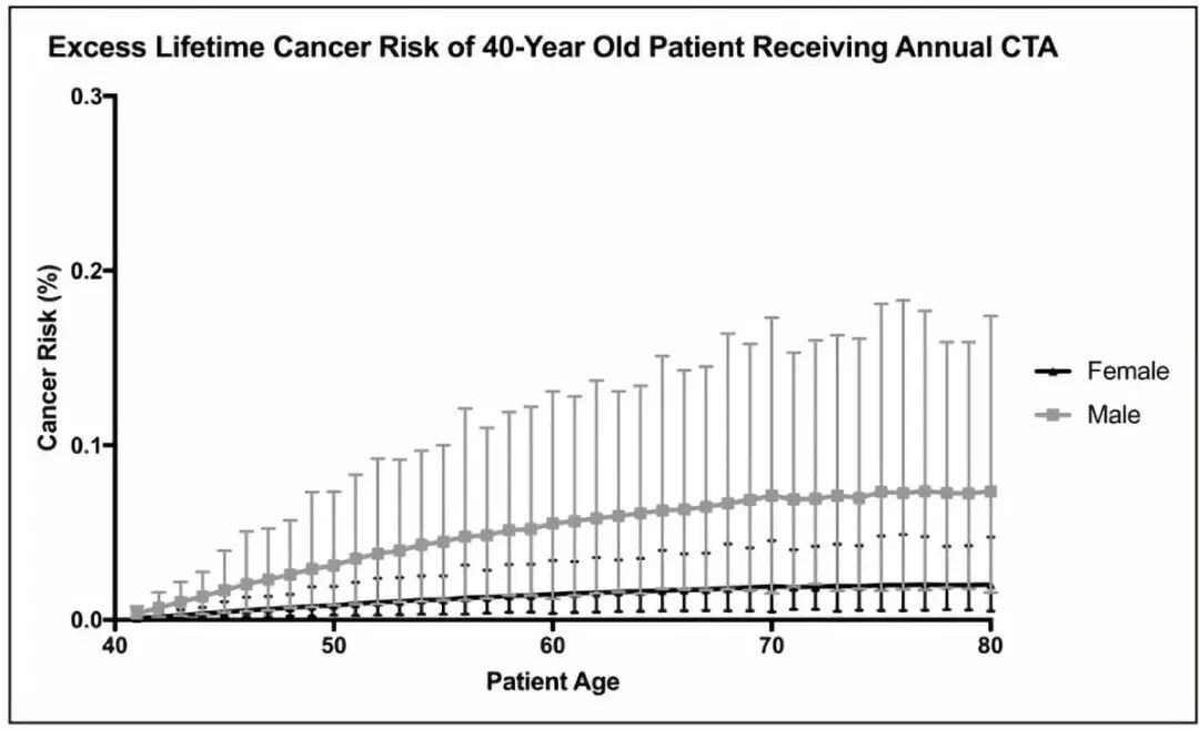 图2. 从40岁开始接受年度CTA随访的患者的辐射诱发脑癌的终生过量致癌风险。
