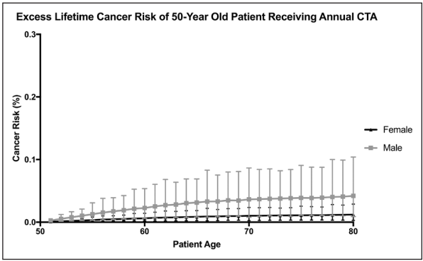 图3. 从50岁开始接受年度CTA随访的患者的辐射诱发脑癌的终生过量致癌风险。