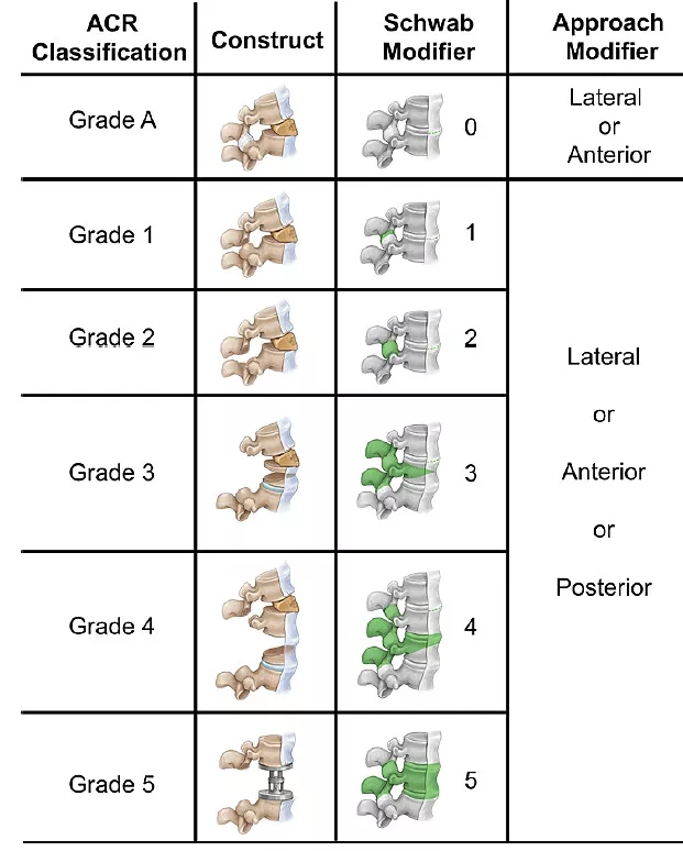 作者在脊柱解剖学基础上提出ACR的6级分类;包括前纵韧带(ALL)松解,以及不同程度的脊柱后部松解或截骨术,含手术入路,如脊柱前方、侧方或后方入路等。具体ACR分级如下,A级:ALL松解,后部元件完整;1级(ACR + Schwab 1级):额外切除下关节突和关节囊;2级(ACR + Schwab 2级):上下小关节、棘突间韧带、黄韧带、椎板和棘突的额外切除术;3级(ACR + Schwab 3级):附加3个节段截骨术,包括椎弓根截骨术;4级(ACR + Schwab 4级):3个节段截骨术,包括椎弓根截骨术和椎间盘切除术;5级(ACR + Schwab 5级):完全或部分切除椎体和两个相邻椎间盘,伴或不伴后部元件的切除(图1)。