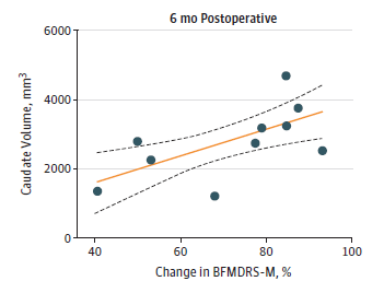 结果显示:盲法视频评级显示,肌张力障碍严重程度于术后1周(平均为-55%,P<0.01)和6个月(平均为-59%,P<0.001)显著改善。UPDRS-Ⅲ得分也有所好转,尽管程度较小(平均分别为-19%和-27%)。非盲法长期随访证实,术后46个月GPi-DBS持续有效。其余预后指标,包括日常生活活动、疼痛严重程度、体重和生活质量均有所提高。尾状核萎缩是患者预后不良的预测因子(r=0.817,P=0.004)(图1)。