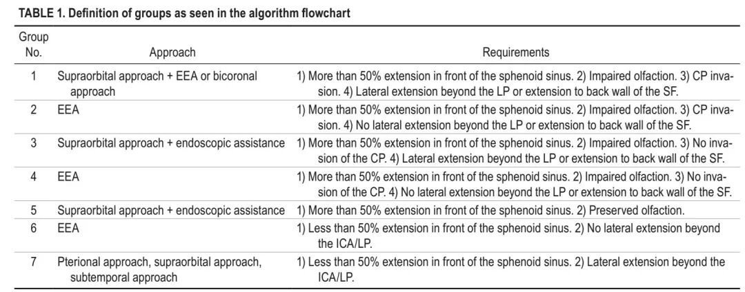 作者指出,该研究设计的以保留嗅觉和视觉为主要目标的治疗方法选择流程(图1),可以达到通过微创入路或经颅入路最大范围地切除前颅底脑膜瘤,取得很好的效果。