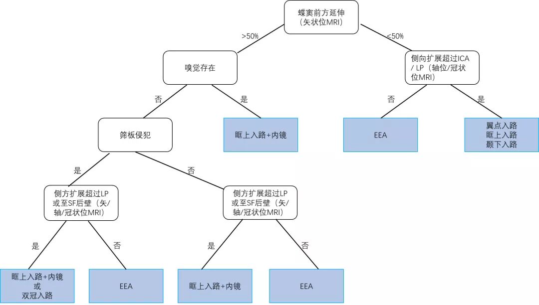 图1. 用于切除前颅底脑膜瘤的治疗决策流程图(蓝色框示最左侧的组1至最右侧的组7)。SF=额窦;ICA=颈内动脉;CP=筛板;EEA=扩大内镜经鼻入路。