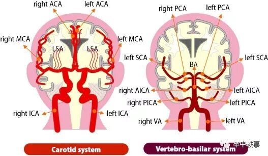在医学院上解剖课时,我们知道有四条入颅血管,双侧的颈内动脉和左右的椎动脉 (上图)。