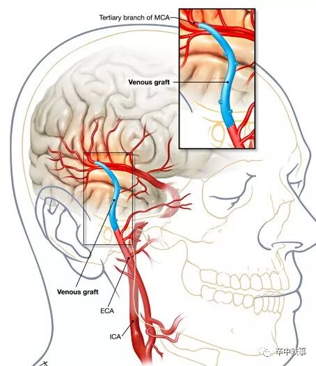 虽然颅内外动脉搭桥 (上图) “预防” 脑大血管闭塞后再次卒中的第二战役临床试验又失败了,有人 “随机应变”,选择影像上有低灌区,内科治疗后症状无缓解的病人,坚持做颅内外动脉搭桥而且报道治疗效果很好。
