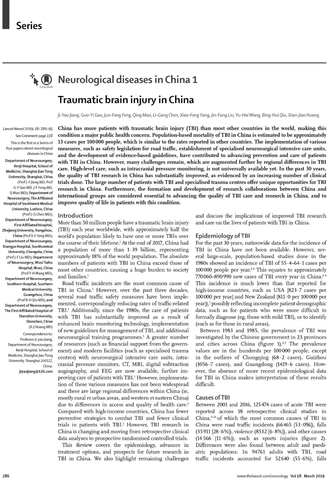 2019年2月13日,上海交通大学医学院附属仁济医院首席专家、上海市颅脑创伤研究所所长、中华医学会创伤学分会主任委员、神外资讯“中国颅脑创伤-神经重症专家组”组长江基尧教授作为唯一通信作者在世界神经科学排名第一《柳叶刀神经病学杂志》 (影响因子 27.138分) 在线发表题为《中国颅脑创伤》的长篇论文。上海交通大学医学院附属仁济医院高国一、冯军峰、毛青,西南医科大学附属医院陈礼刚,浙江大学医学院附属第一医院杨小锋,中南大学湘雅医院刘劲芳,无锡解放军904医院王玉海,南方医科大学南方医院邱炳辉和深圳大学第一附属医院黄贤键是论文共同作者。