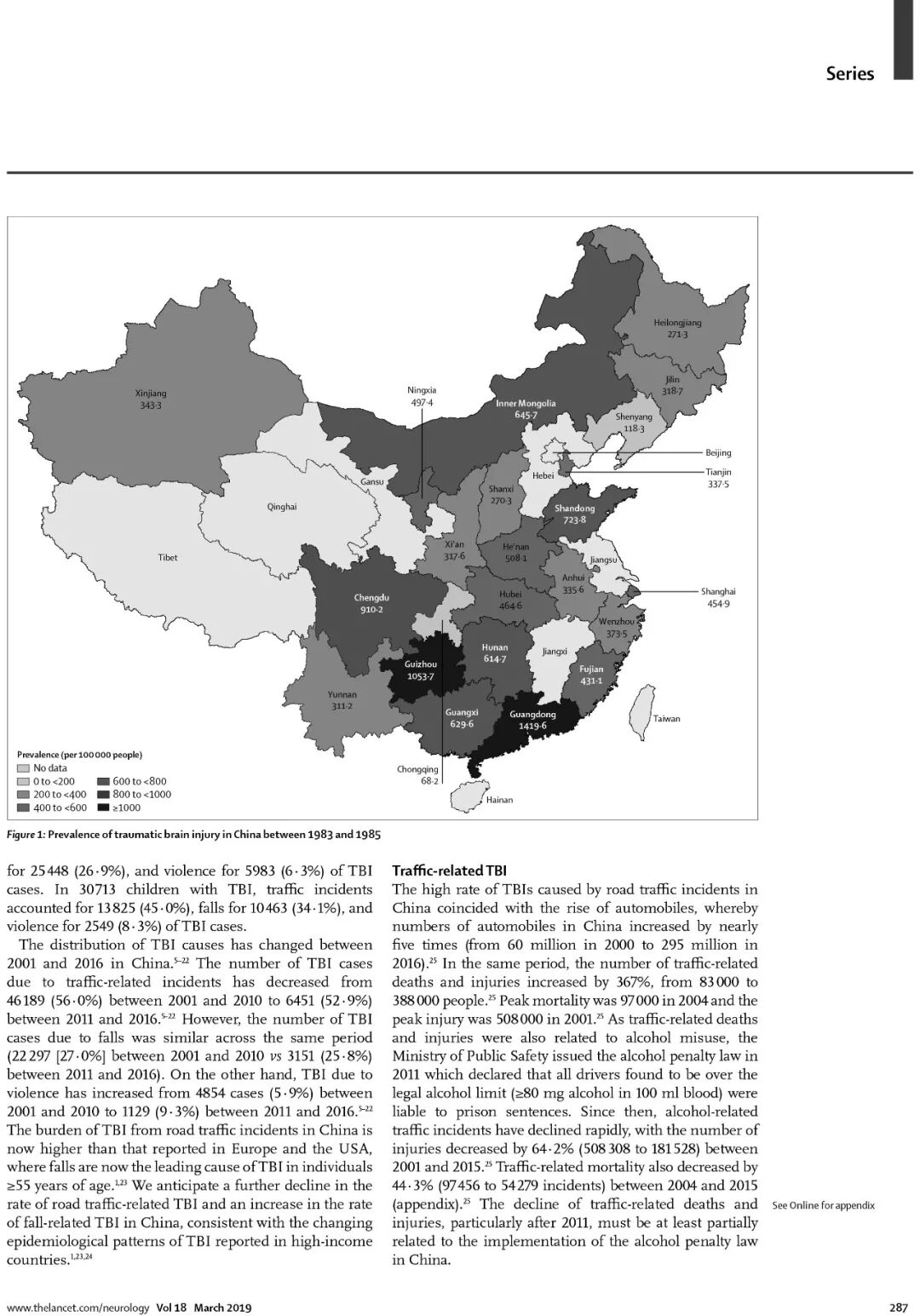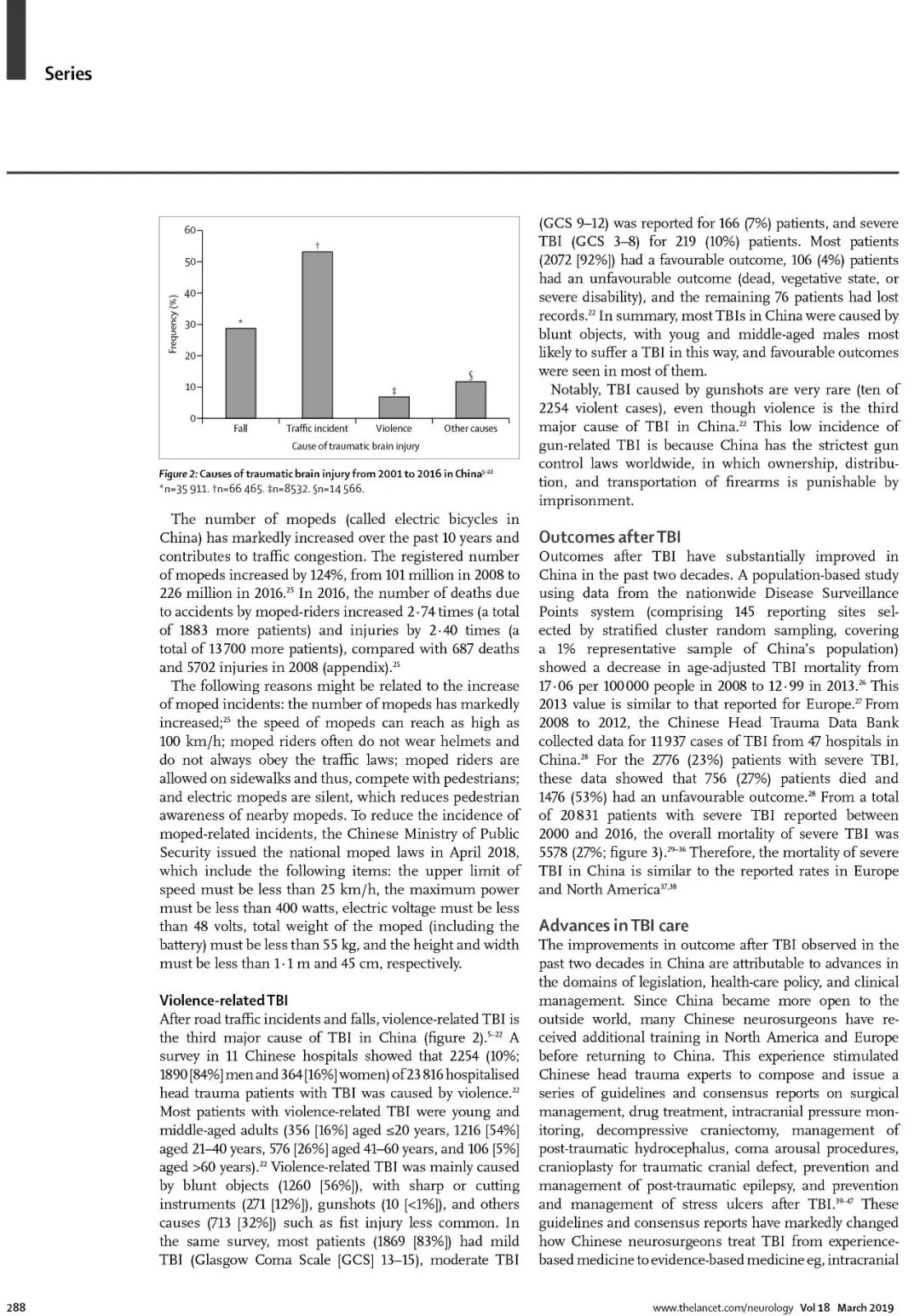 中国颅脑创伤年发生率为55.4-64.1/10万,导致数十万死残,是严重的公共卫生问题。论文通过大量数据分析, 全面剖析了中国颅脑创伤发生的特点和现状。 大数据显示:2011年中国酒驾入刑以来,汽车导致的颅脑创伤有所减少, 但是,电动车导致的颅脑创伤发生率明显增加。