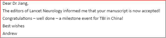该论文是中国专家首次在世界医学杂志报道中国颅脑创伤取得的成就、引起国际同行对中国颅脑创伤的高度关注和认可。《柳叶刀神经病学杂志》科学顾问、国际神经创伤协会前任主席、比利时安特卫普大学神经外科Andrew Maas教授第一时间向江基尧教授发来邮件称赞:该论文发表在中国颅脑创伤发展历程中具有里程碑意义。