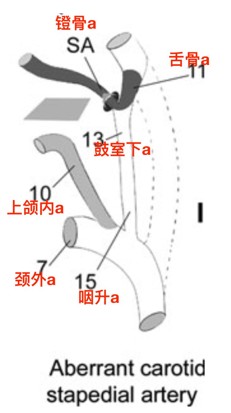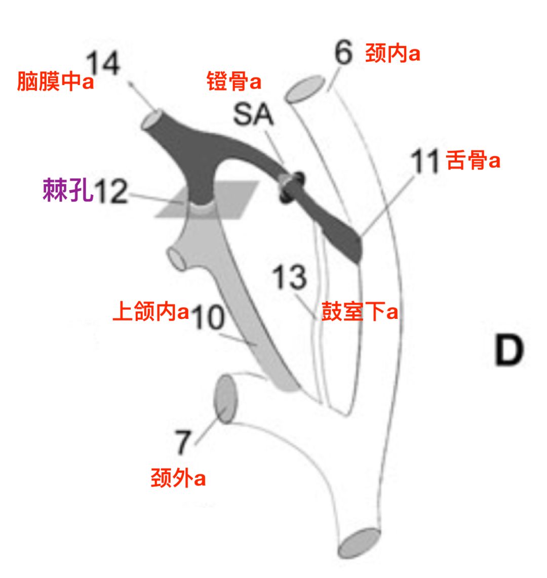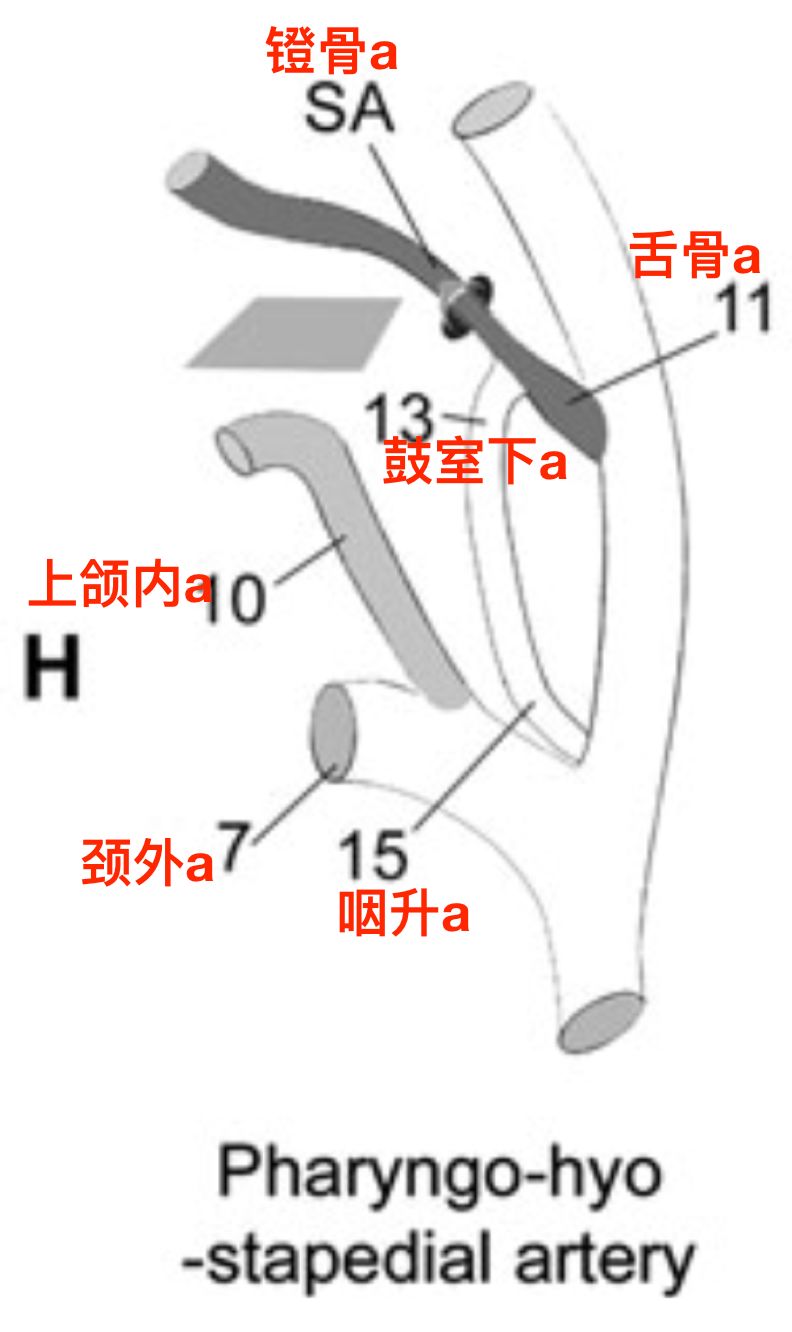镫骨动脉发自舌骨动脉,经过镫骨孔。镫骨动脉下干和腹侧咽动脉的吻合通过棘孔。镫骨动脉的血流反转,形成脑膜中动脉(Hitier 2013)。