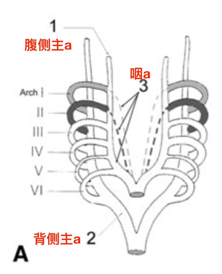 在腹侧主动脉和背侧主动脉之间形成了成对的六条主动脉弓,也称咽弓。每个主动脉弓腹侧部分称为“咽动脉(pharyngeal artery)”(Hitier 2013)。