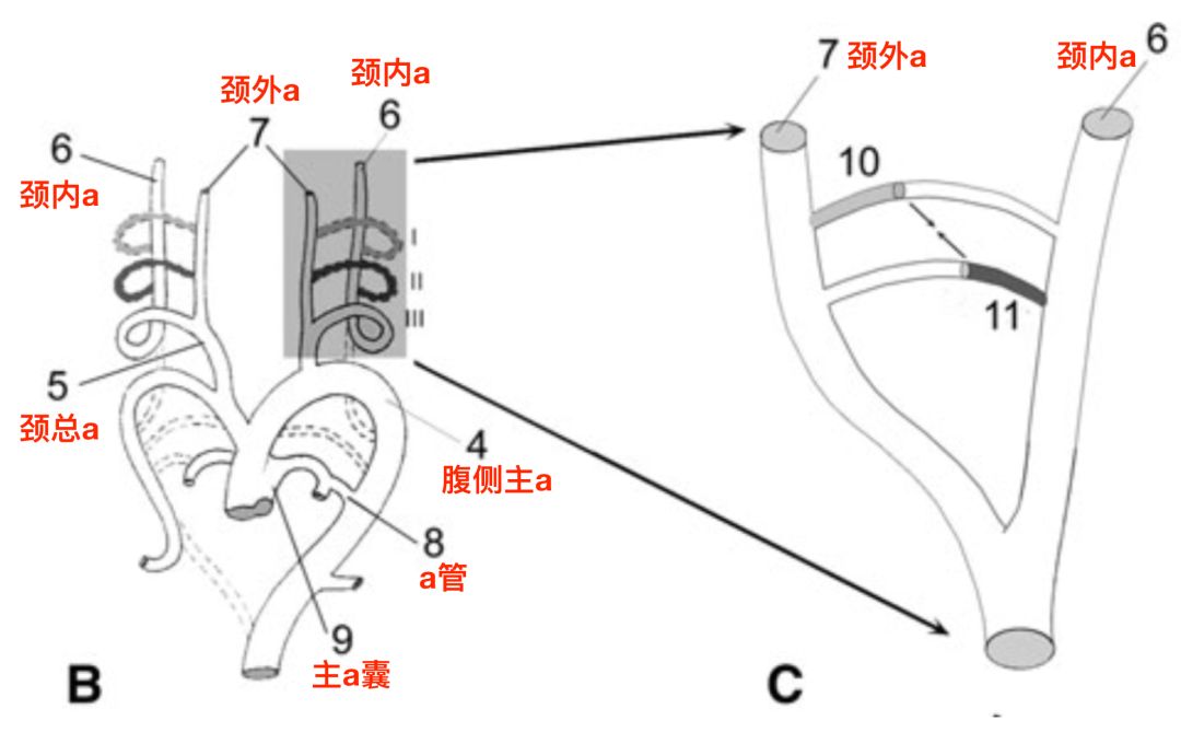 腮弓系统(branchial system)的胚胎发育,产生了六对主动脉弓(aortic arches)和相对应的动脉。这些主动脉弓连接胚胎的腹侧主动脉和背侧主动脉。第一主动脉弓发出下颌动脉(mandibular artery),后期退化。第二主动脉弓成为舌骨动脉(hyoid artery)。第三主动脉弓形成颈总动脉和近端颈内动脉。当第一和第二主动脉弓进化,下颌动脉和舌骨动脉就成为第三主动脉弓的分支。