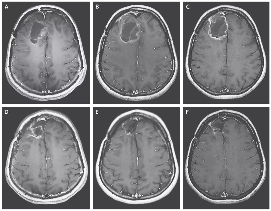 图1. 给予溶瘤病毒后的MRI影像学表现。A.MRI显示接受剂量1(108 TCID50)的PVSRIPO时肿瘤大小;B.PVSRIPO输注2个月后肿瘤扩张;C.输注6个月后肿瘤有所缩小;图D和E分别为给PVSRIPO后12个月和24个月时的结果;F.输注病毒后58个月时的肿瘤残余腔,显示肿瘤缩小。