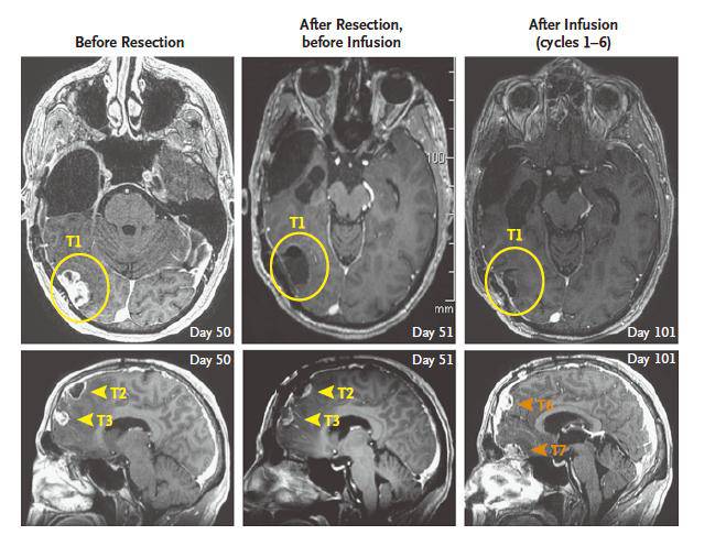 图1. 右侧颞叶、枕叶的T1处复发GBM部分切除后瘤腔内给以输入免疫T细胞治疗,发现T1局部未见肿瘤明显进展,而右额叶T2-T7处的肿瘤增大。