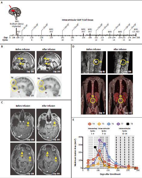 图2. 经脑室内靶向IL13Rα2药物的CAR-T疗法后,颅内复发GBM(B-C图)和脊髓转移GBM(D图)均明显缩小。