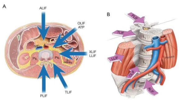 图1. A.各类椎体间融合手术方式;B.以腰大肌和前方血管系统解剖确定不同手术方式。