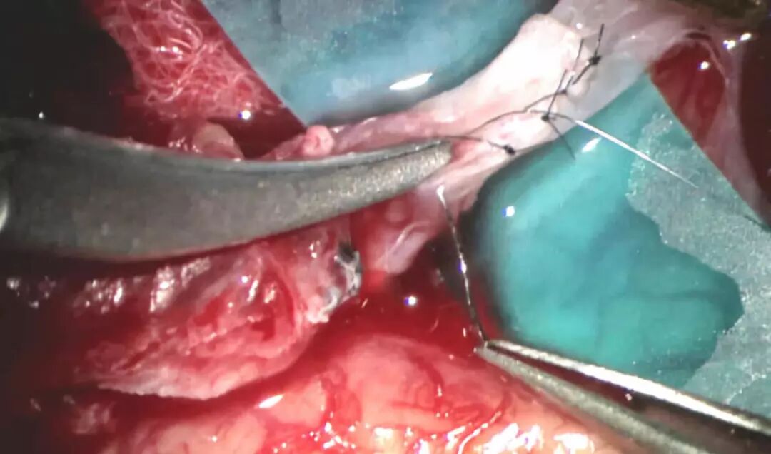 其二,再植技术,即夹闭动脉瘤时保留M2一支而牺牲另一支,受损支作为受体血管而另一支作为供体血管,行血管吻合。