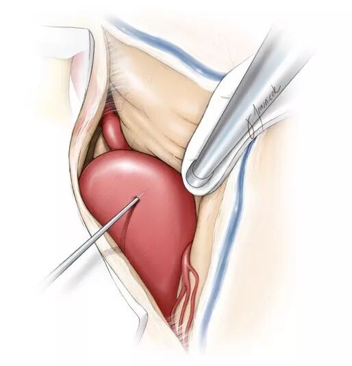 在夹闭非血栓性巨大动脉瘤时,如果临时夹未完全使动脉瘤萎陷,可以细套管针套穿刺瘤顶,接吸引器以行瘤内减容。
