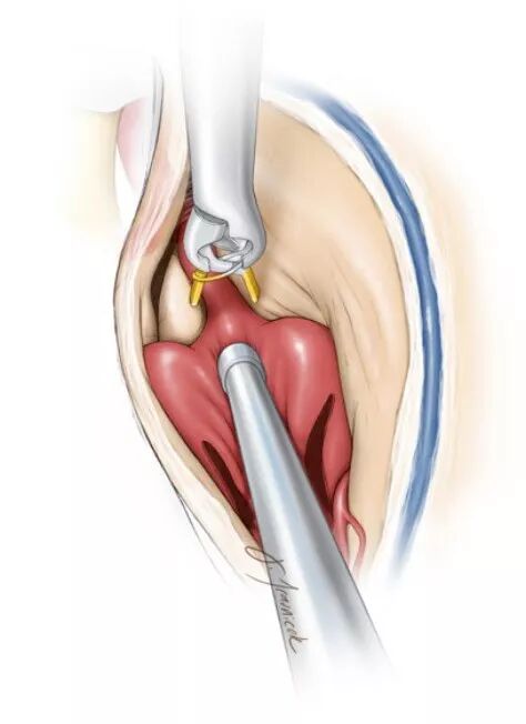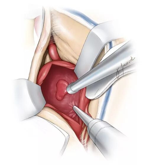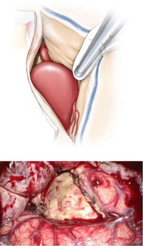 图7. 一旦切开瘤顶,以垂体咬骨钳或者超声吸引器去除瘤内血栓(引自Tew,van Loveren,Keller)。