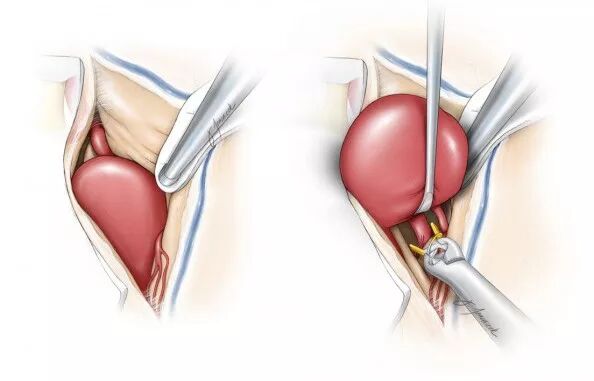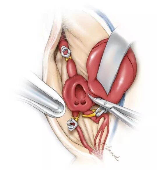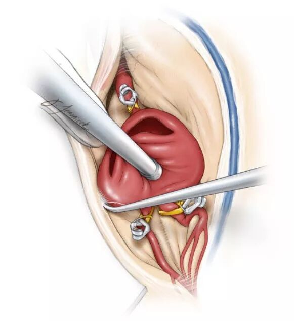 图12. 切除瘤壁时勿离M1流入道和M2流出道太近,保留足够的瘤壁组织,以备关闭瘤口时于二分叉处重建一个囊袋状结构(引自Tew,van Loveren,Keller)。