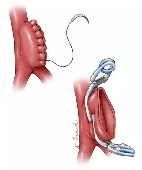 图13:虽然有些同事以缝线缝合瘤囊(左图),而笔者却不这么做,因为这很耗时。笔者习惯于瘤颈处放两枚弧形夹(下图)。所谓的“完美夹闭”是很危险的,常导致M2流出道狭窄。由于瘤颈壁厚和动脉硬化的存在,外科医生在瘤外探查时可低估血管腔狭窄的程度(引自Tew,van Loveren,Keller)。
