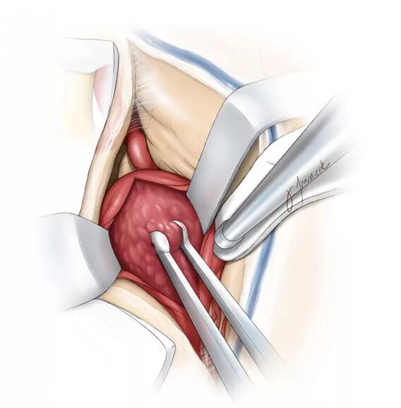 图8. 清除瘤内血栓直至见到瘤内新鲜出血。在将大部分血栓清除前,笔者尽量避免打开残腔。如果必须行内膜剥脱,应尽量避开M1流入道和M2流出道,以防二者分离和栓塞(引自Tew,van Loveren,Keller)。