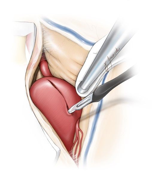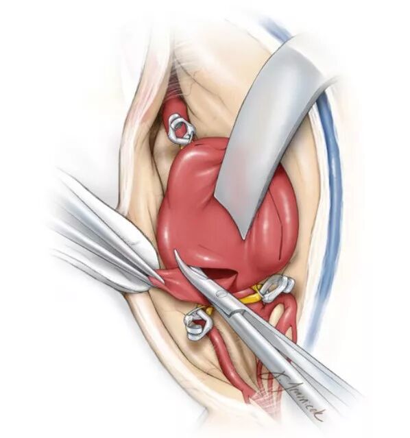 在瘤颈或瘤顶存在钙化斑提示需做血运重建的准备。影像学上瘤顶的轻微钙化常伴有瘤颈的钙化。瘤内血栓在瘤腔的部位很重要。为减少临时阻断时间,笔者在血管开放状态下切开瘤囊并切除血栓直到出血。此时以临时夹孤立动脉瘤。此时需对瘤顶切口作精确设计。