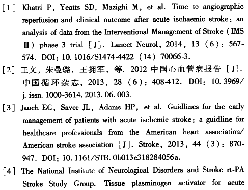 (3)采用卒中量表评估病情严重程度。采用美国国立卫生院卒中量表(National Institute of Health StrokeScale, NIHSS)进行神经系统功能评定。