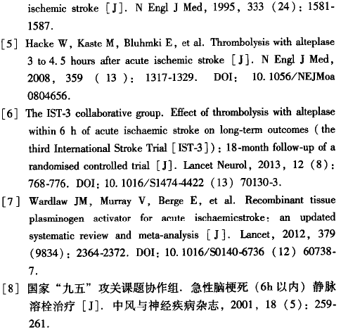 2013年发表的第三次国际卒中研究(The third International Stroke Trial,IST-3) 提示发病6 h内静脉溶栓治疗急性脑梗死可能是安全有效的,80岁以上患者发病3h内溶栓的疗效和安全性与80岁以下患者相似,但80岁以上患者发病3~6h溶栓的疗效欠佳[6]。一项系统性评价分析了12项rt-PA静脉溶栓试验,包括7012例患者,提示发病6h内静脉溶栓治疗急性脑梗死是安全有效的,其中发病3h内rt-PA治疗的患者获益最大[7]。