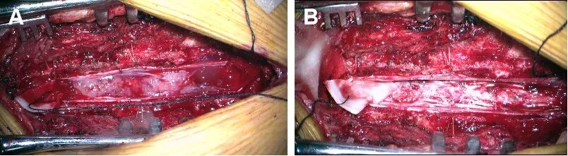 图5. 胸6-8椎管内病损切除术术中所见。A: 切开硬膜见肿瘤位于胸6-8,脊髓背侧及两侧,色灰红,质地软,血供一般,脊髓受压明显;B: 沿肿瘤与脊髓边界大部切除肿瘤。