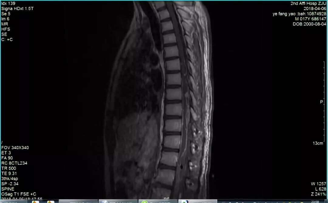 背部后正中可见一长约15cm的手术瘢痕,愈合可,上肢肌力Ⅴ级,下肢肌力Ⅴ级,肌张力正常,双下肢浅感觉减退,深感觉正常,病理征阴性。